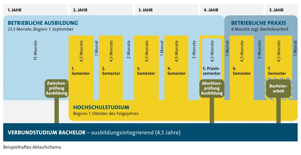 - 3,5 Jahre (kann durch höheren Schulabschluss oder sehr gute Leistungen bis auf 2,5 Jahre verkürzt werden)